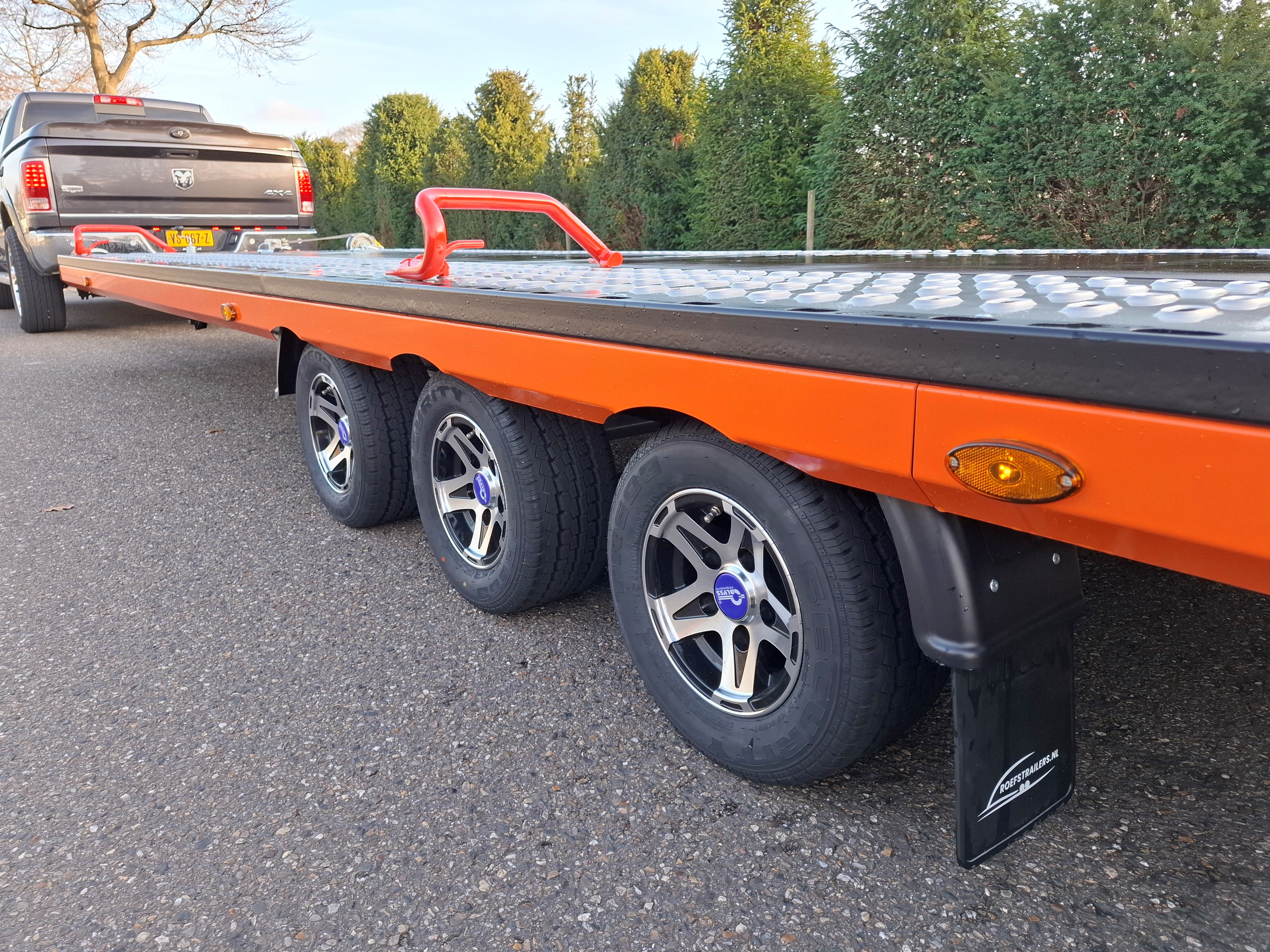 Standaard is de trailer voorzien van: steunwiel, schokbrekers, aluminium reservewiel, lier, 200cm aluminium oprijplaten, wielkasten + spatlappen, 10” alu velgen, led-verlichting, middenbodem voorzien van watervaste multiplex, chassis van verzinkt en zwart RAL9005 gepoedercoat staal, -zijkant laadvloer gepoedercoat staal Oranje RAL2007,aluminium velgen en opbergkasten 65x65x25 cm, 2 wielstoppers